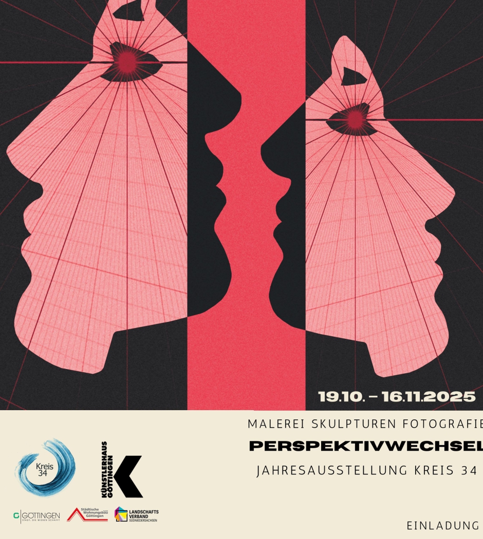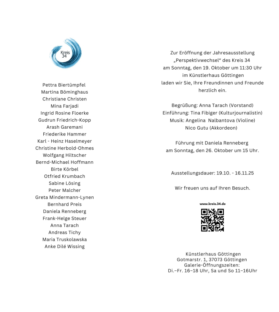 19. Oktober bis 16. November 2025: – Jahresausstellung Kreis 34 unter dem Titel: PERSPEKTIVWECHSEL im Künstlerhaus Göttingen –Ausstellung mit Malerei, Skulpturen und Fotografien.