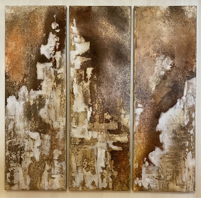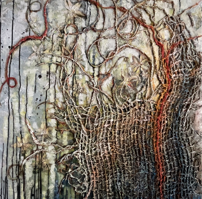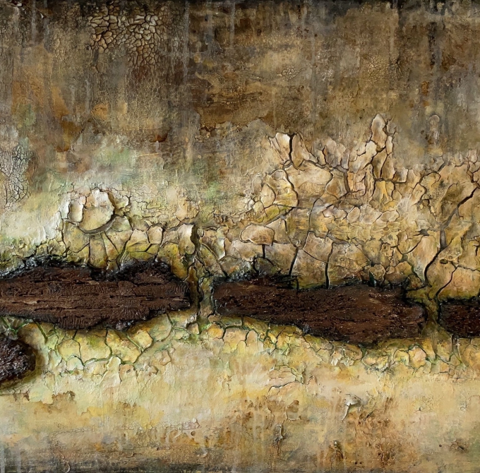 Neben den üblichen kreativen Malmaterialien sammle ich auf meinen Spaziergängen auch verschiedene organische und nicht organische Dinge. Diese Fundstücke arbeite ich gerne in meinem Atelier (Atelierhaus Göttingen) in meine Bilder und Skulpturen ein. Mein künstlerisches Tun und das, was am Ende dabei entsteht, sind somit sehr vielfältig. Vielfältig sind auch die Techniken, die ich verwende. So nutze ich gerne verschiedenste Drucktechniken, Hoch- und Tiefdruck, wie klassischen Linoldruck, Drucke mit Tetrapak, Ecodruck oder Gelliprint. Gerne kombiniere ich Drucke im Sinne von Mixed Media mit anderen künstlerischen Verfahren. Ich liebe es zu experimentieren, mit unterschiedlichsten Materialien, Erden, Sand, verschiedensten Pulvern wie Steinmehl, Kaffeepulver, Pigmenten, Wachs und anderem mehr, ergänzt durch Tuschen, Tinten, Acryl-, Öl-, Aquarell- oder Dispersionsfarben. Die klassischen künstlerischen Techniken, die ich im Kontext meiner künstlerischen Ausbildung erlernt habe, treten in den vergangenen Jahren zunehmend mehr in den Hintergrund, vorrangig geworden ist für mich das Spiel mit Material, Form und Farben. Viele Jahre als Kunsttherapeutin in verschiedenen Kliniken psychotherapeutisch tätig, haben meinen Blick insbesondere für das, was uns gut tut, besonders geschärft, auch dies beeinflusst meine Kunst.